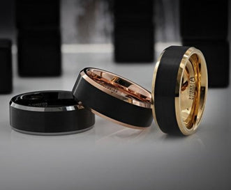 Fashioned from versatile tungsten, this band features a silver brushed exterior with a green center groove and gold beveled edges. Perfect for those who appreciate its unique color combination.