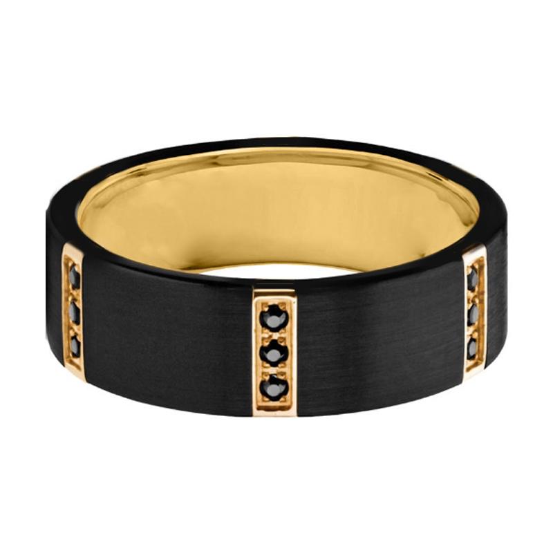 This Contemporary Black Titanium Brushed Finish Wedding Band has gracefully fashioned Yellow Gold inside that is providing a striking contrasting look. The outer of the ring contains 3 yellow gold plated bezels and each containing a row of three beautiful black diamonds to complement its modern design.